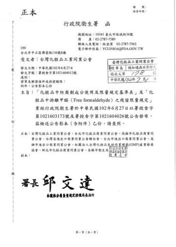 化粧品中防腐劑成分使用及限量規定基準表(署授食字第1021603173號)(發布日期2013-06-27)