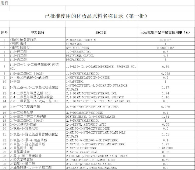 因此網路上就可以下載的到大陸官方發出的一份原料清單,上面有各種原料添加濃度,如下面這些截圖...