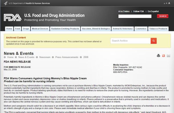 FDA Warns Consumers Against Using Mommy's Bliss Nipple Cream