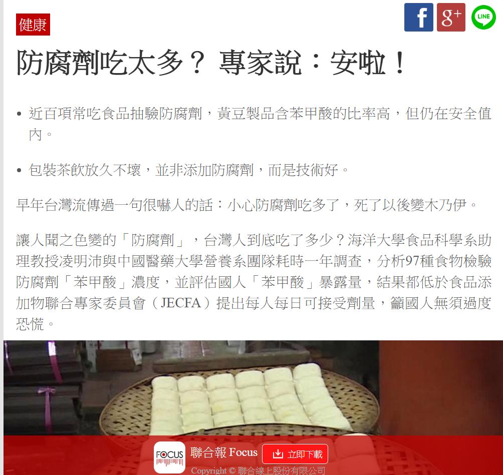 還有之前有一篇新聞也報導了關於苯甲酸Benzoic Acid防腐劑,新聞內是這樣寫的:『海洋大學食品科學系助理教授凌明沛與中國醫藥大學營養系團隊耗時一年調查,分析97種食物檢驗防腐劑「苯甲酸」濃度,並評估國人「苯甲酸」暴露量,結果都低於食品添加物聯合專家委員會(JECFA)提出每人每日可接受劑量。』(新聞連結:http://a.udn.com/focus/2016/04/23/20260/index.html )