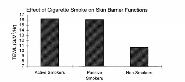 香煙煙霧可以降低角質層的水分含量,引起輕微的炎症反應。在老鼠體內的實驗中,證實主動吸煙和被動吸煙會導致皮膚過早老化。