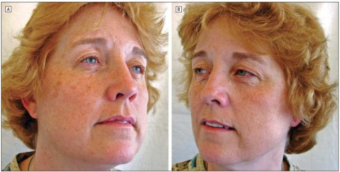 雙胞胎吸煙者Twin 1 和非吸煙者Twin 2 的臉部肌膚對比,twin 1 的吸煙史約為52.5 pack-years(每天吸煙的數量乘以煙齡的總和),兩人的生活緯度和太陽照射累積時長接近。