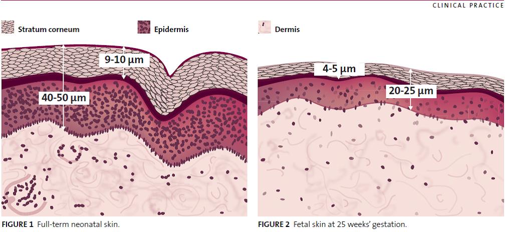 人類的皮膚要在青春期時才發育完整,才能真正發揮皮膚的功能,在此之前的皮膚都是屬於比較脆弱的狀態,尤其是嬰幼兒,特別是1歲前的嬰幼兒皮膚更脆弱(如圖一:左邊是滿1歲的嬰幼兒皮膚,右邊是出生25週的嬰幼兒皮膚的皮膚厚度及結構說明圖),透過該圖,我們可以很清楚的就能理解,剛出生的嬰幼兒皮膚結構非常的薄,表皮層的厚度都只有左邊圖的一半(一般成年的皮膚依照部位之不同,表皮層的厚度分別大約是在0.05~1.5mm,最薄的部位是眼皮,最後的部位的背部),因此我們必須針對不同時間的嬰幼皮膚來做瞭解。